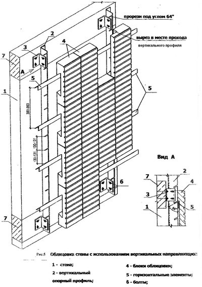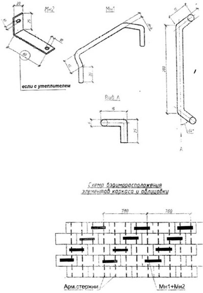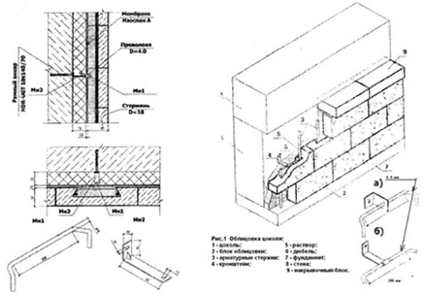 Основная схема облицовки стен блоками «зигзаг» предполагает их установку на основу (фундамент, уголок) без применения раствора в швах, с зазором между ними и стеной, который заполняется раствором. Облицовка из блоков армируется вертикальными стержнями и связывается со стеной кронштейнами. На стене с утеплителем применяются кронштейны с удлиненным на ширину утеплителя плечом.