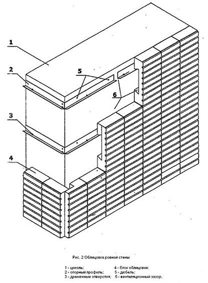 Облицовка блоками с их опорой на фиксаторы в нижней части профилей