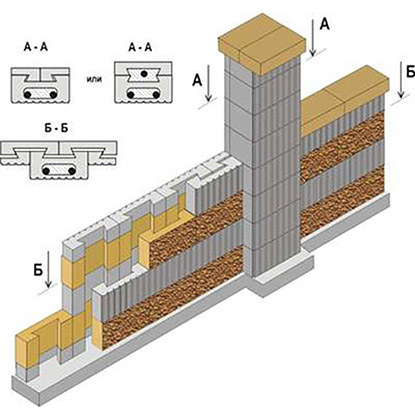 - одновременно с кладкой вести заполнение бетоном проармированных пустот между блоками в столбах;