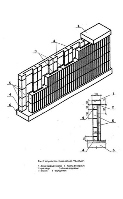 Ширина стенки забора - 145 мм, 245 мм или 345 мм зависит от ширины применяемых блоков (рис.3). При установке блоков без раствора в швах из-за допустимого разброса их размеров в пределах 2 мм возможно неплотное прилегание блоков друг к другу. В этом случае рекомендуется в верхнем из соседних рядов устанавливать блоки, переворачивая их основанием вверх.