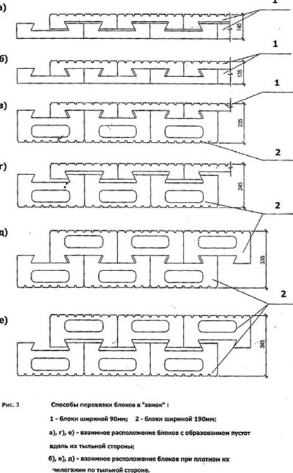 - для перевязки блоков по вертикали сдвинуть блоки в одном из слоев на половину стандартной высоты блока – установить доборные блоки высотой 95 мм; в отсутствие последних забить в зазор между блоками из соседних рядов отрезки арматуры, не сдвигая блоки;