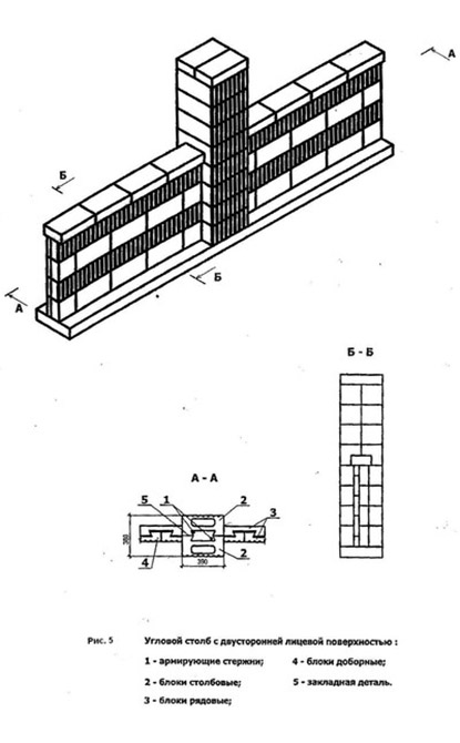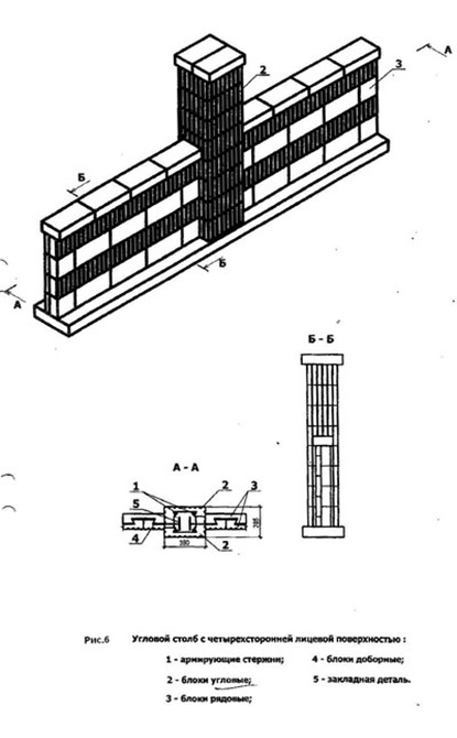 На рис. 4 -7 приведены типовые решения по устройству столбов из рустованных блоков: рядовых с лицевой поверхностью в одну сторону (рис.4) и в две стороны (рис.5), углового (рис.6), усиленного (рис.7). В первом случае используется замковое соединение блоков, для остальных необходимы закладные детали.