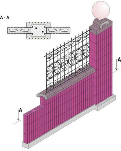 - выполнить кладку стенок забора двухсторонними рустованными блоками шириной 90 мм на связующем растворе, заклинив стенки между блоками «зигзаг» столбов и применяя горизонтальное армирование;