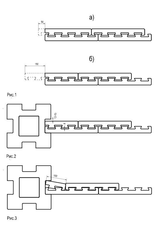 - установить на фундамент на выравнивающий слой кладочного раствора, но без раствора в швах, несколько столбовых блоков для каждого столба и «в замок» первый ряд блоков «зигзаг квадро»; при этом оба крайних соединенных «в замок» блока стенки должны быть заведены в паз на стороне столба – для этого один из них должен быть укорочен (отрезан) на 50 мм или 150 мм (рис.1, а, б);
